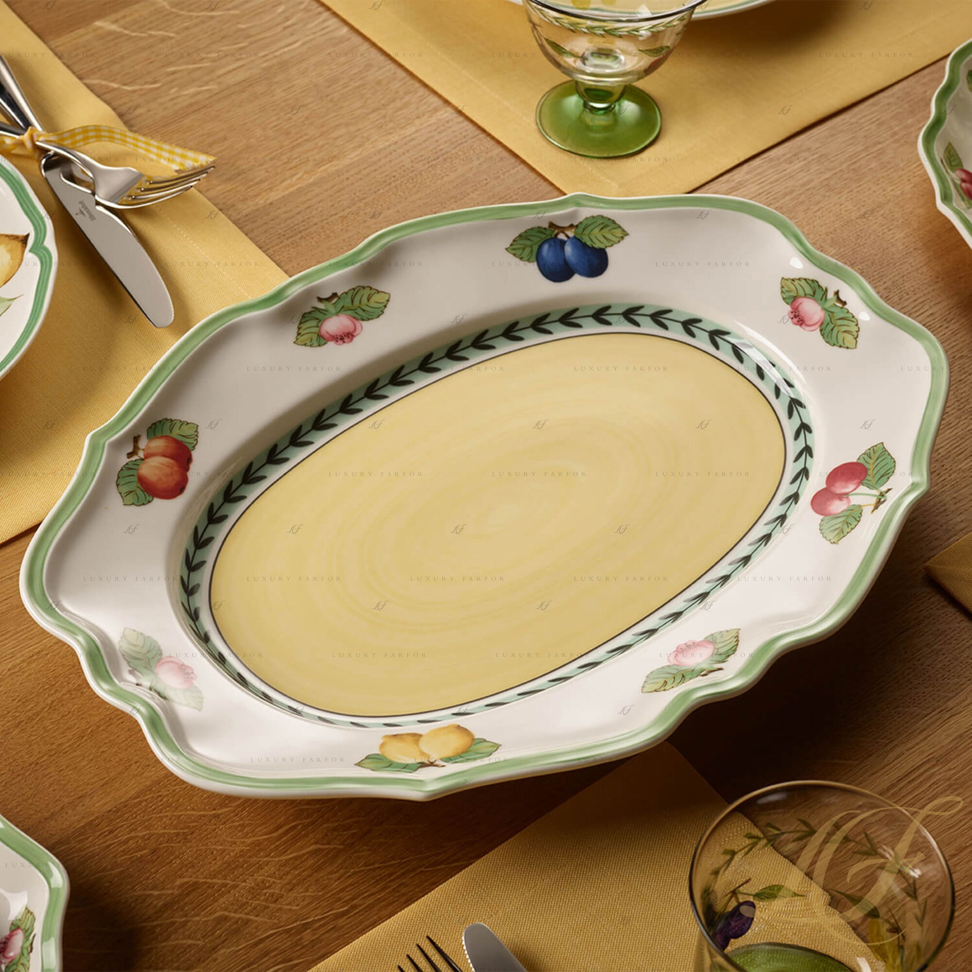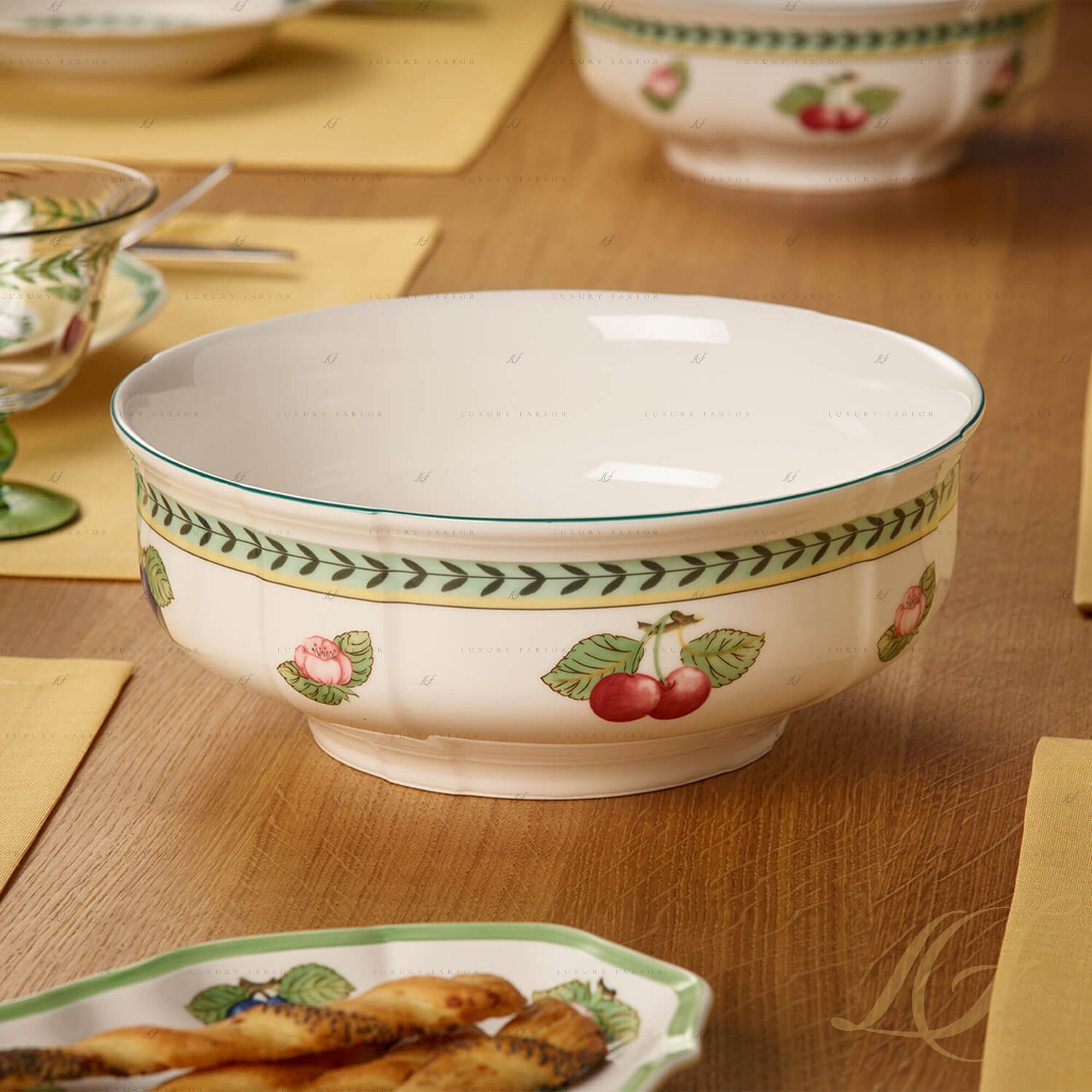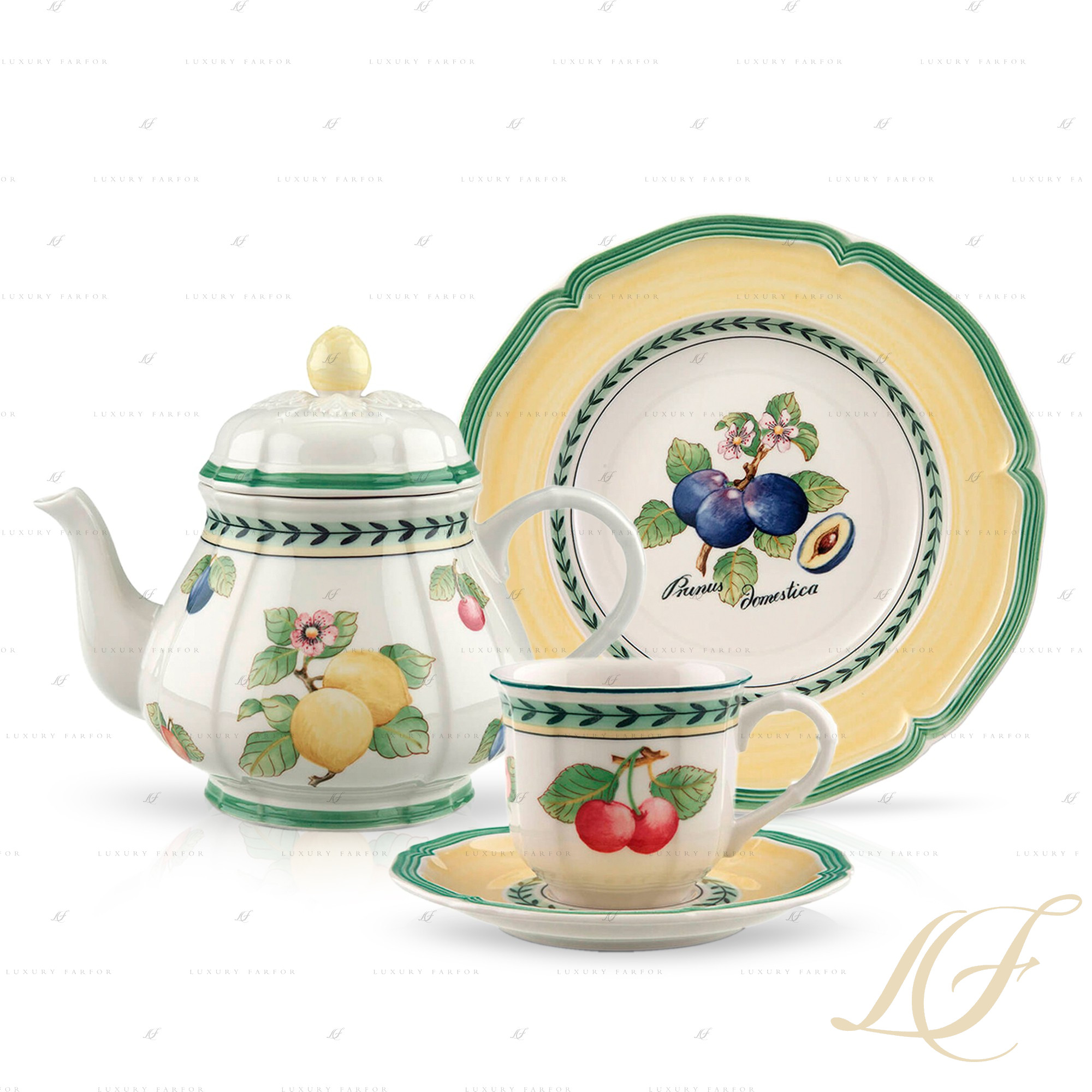 Фарфоровый сервиз French Garden – это образец классического декоративно-прикладного искусства, вдохновленного природой. Villeroy & Boch приглашает вас на прогулку по летнему французскому саду, где фруктовые деревья манят своими наливными спелыми плодами, а благоухающие цветы обволакивают густым ароматом. Спелые сливы, вишни, лимоны, яблоки и другие фрукты выполнены рукой талантливого художника и подчеркнуты безупречной белизной костяного фарфора. Посуда дополнена эффектной гирляндой из ветвей и листьев, а также резным краем, который очерчен широким ярко-зеленым контуром. Сервиз Виллерой и Бох из коллекции Френч Гарден привлекает внимание не только изумительным флористическим мотивом, но и нестандартной формой предметов. Сочетание округлых силуэтов с резными краями и шестигранными элементами придает посуде French Garden особое игривое настроение.