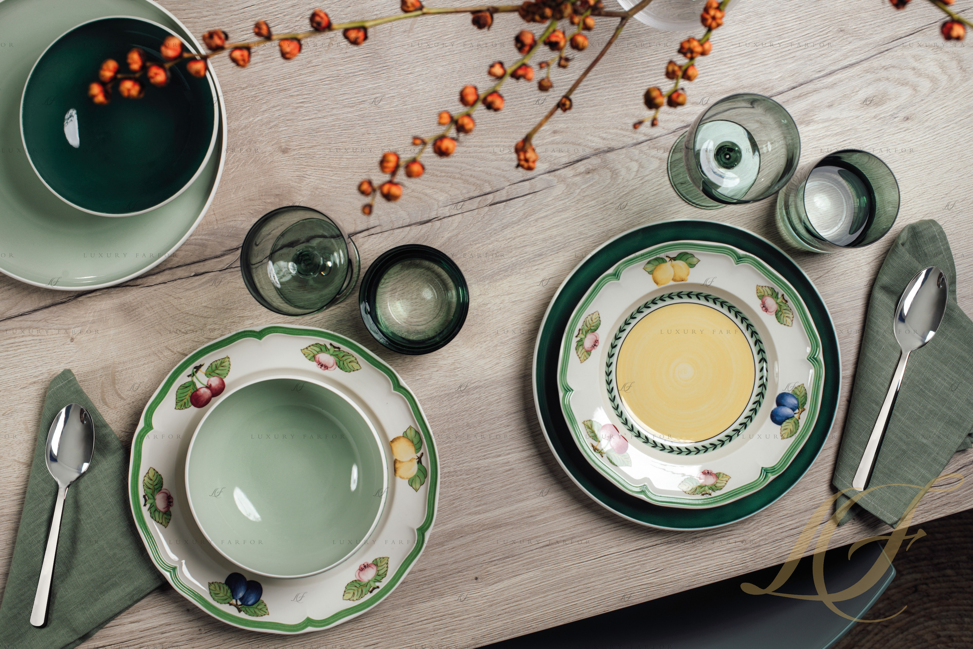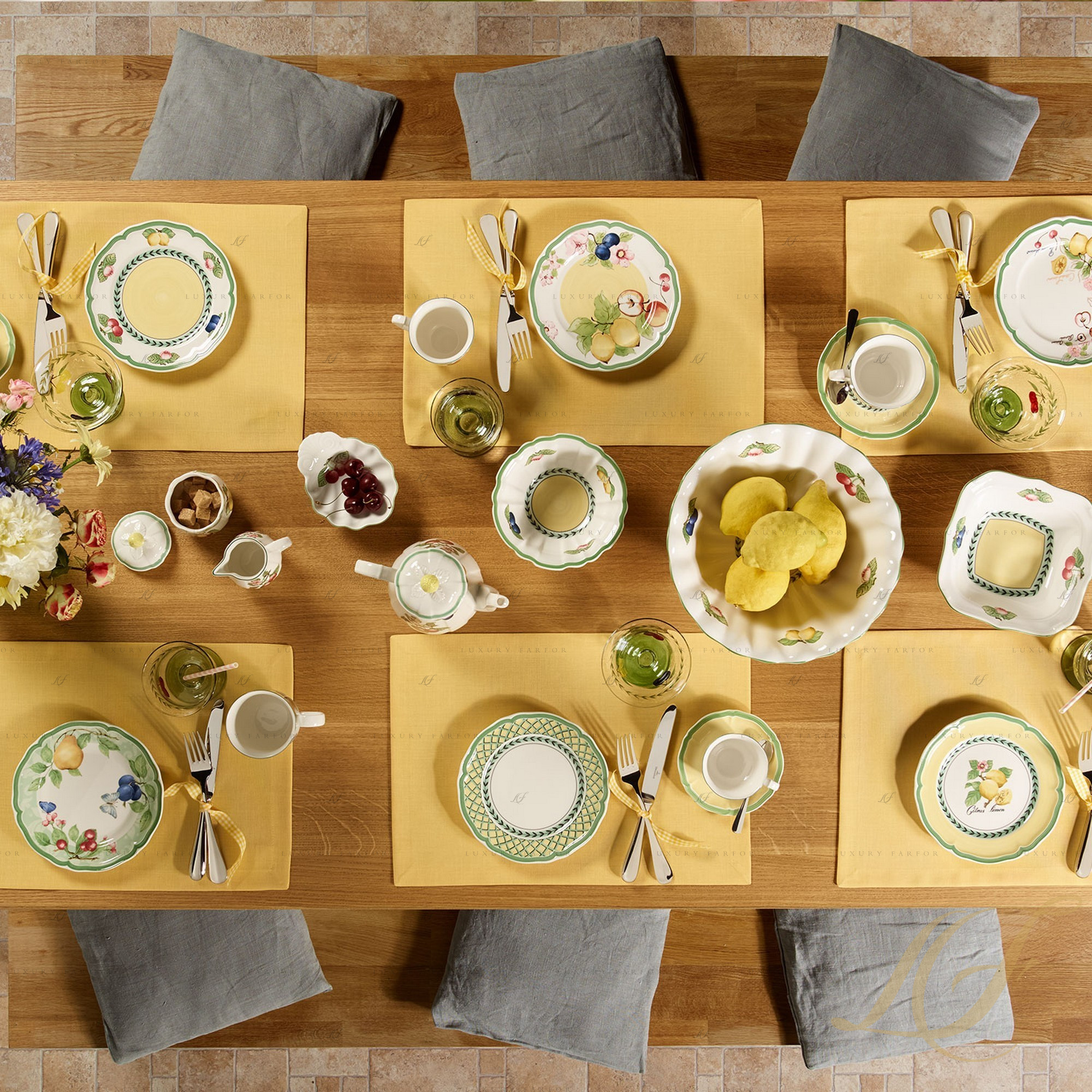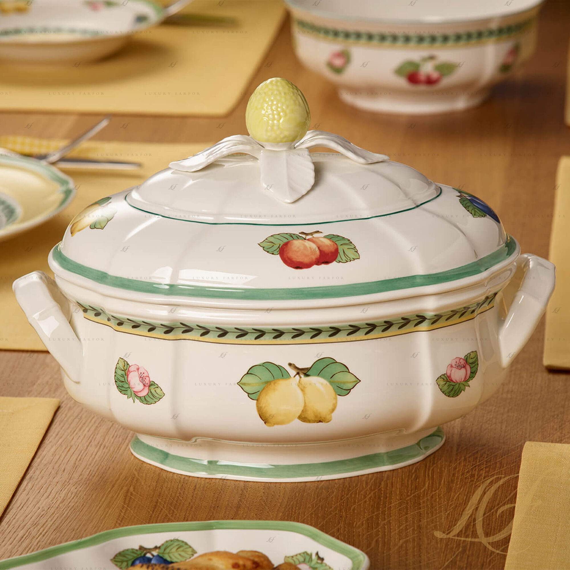 Фарфоровый сервиз French Garden – это образец классического декоративно-прикладного искусства, вдохновленного природой. Villeroy & Boch приглашает вас на прогулку по летнему французскому саду, где фруктовые деревья манят своими наливными спелыми плодами, а благоухающие цветы обволакивают густым ароматом. Спелые сливы, вишни, лимоны, яблоки и другие фрукты выполнены рукой талантливого художника и подчеркнуты безупречной белизной костяного фарфора. Посуда дополнена эффектной гирляндой из ветвей и листьев, а также резным краем, который очерчен широким ярко-зеленым контуром. Сервиз Виллерой и Бох из коллекции Френч Гарден привлекает внимание не только изумительным флористическим мотивом, но и нестандартной формой предметов. Сочетание округлых силуэтов с резными краями и шестигранными элементами придает посуде French Garden особое игривое настроение.